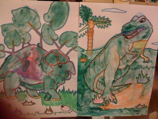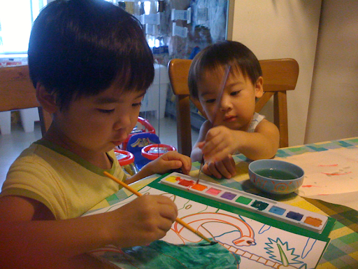 今天放重陽節假,一早起來一起油水彩。現在弟弟什麼東西都要試,所以什麼都要預他一份。